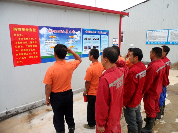 每天上崗前,各工種職工都會聚集在凍結(jié)車間門口,開展崗前安全宣誓活動。崗前宣誓作為項(xiàng)目部班組交接班工作的重要內(nèi)容,是接班員工必須履行的工作程序。它不僅僅是一種形式,而且是對安全工作的一種提示,對安全責(zé)任的一種提示,通過這種必要的、有效的形式來推動和促進(jìn)項(xiàng)目部安全生產(chǎn)。