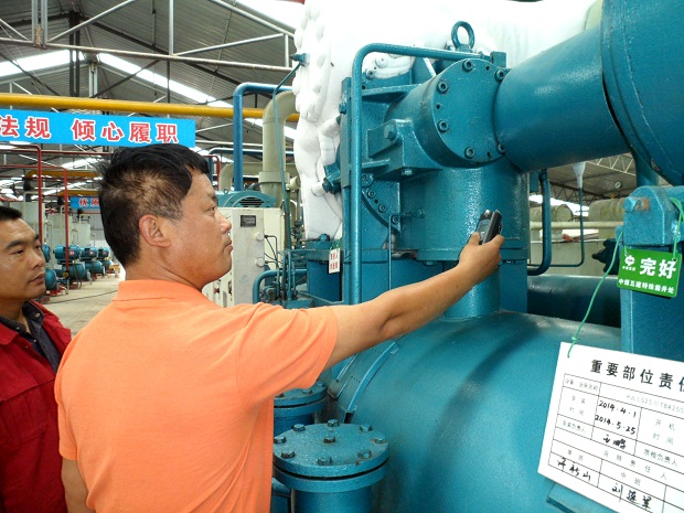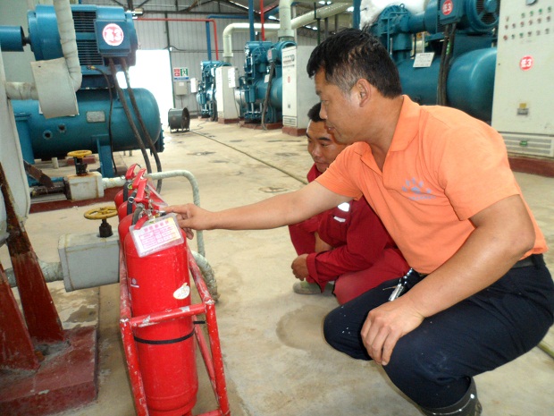 班組進(jìn)行安全隱患排查,班長正在檢測滅火器壓力是否達(dá)標(biāo)